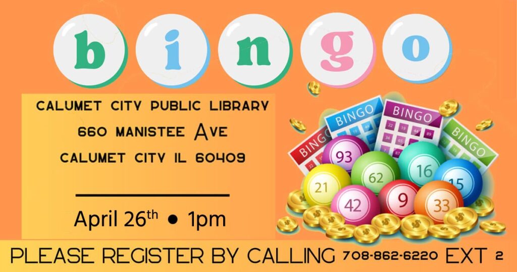 Bingo This Friday! April 23, 2024April 29, 2024 Staff Please sign up on our event calendar: https://www.calumetcitypl.org/event/bingo-10/ Written by Staff
