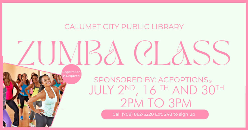 Our Adult Services Department in partnership with AgeOptions will have Zumba class on July 2nd, 16th and 30th. Call (708) 862-6220 ext 248 to register.
