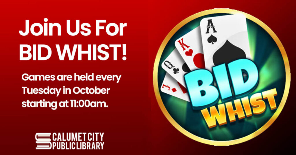 Bid Whist October 2, 2025October 2, 2025 Staff Join our Adult Services team every Tuesday in October starting 11am for Bid Whist! Call (708) 862-6220 ext 248 to register. Written by Staff