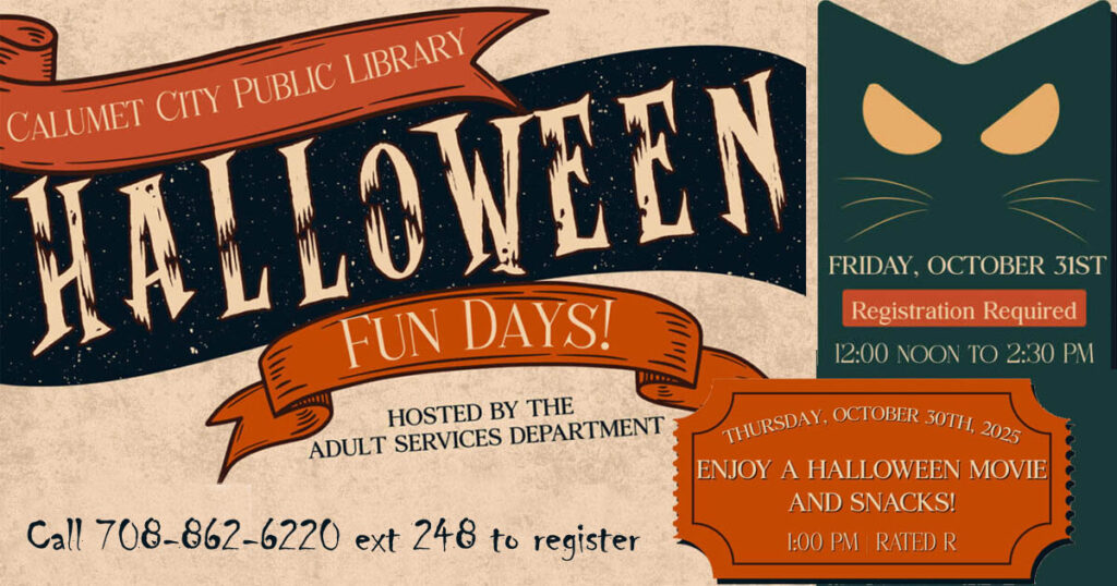 Join our Adult Services team for Halloween Fun Days! The two day event kicks off on October 30th with a movie at 1pm. On October 31st it picks back up from noon to 2:30pm to celebrate Halloween! Call 708-862-6220 ext 248 to register.