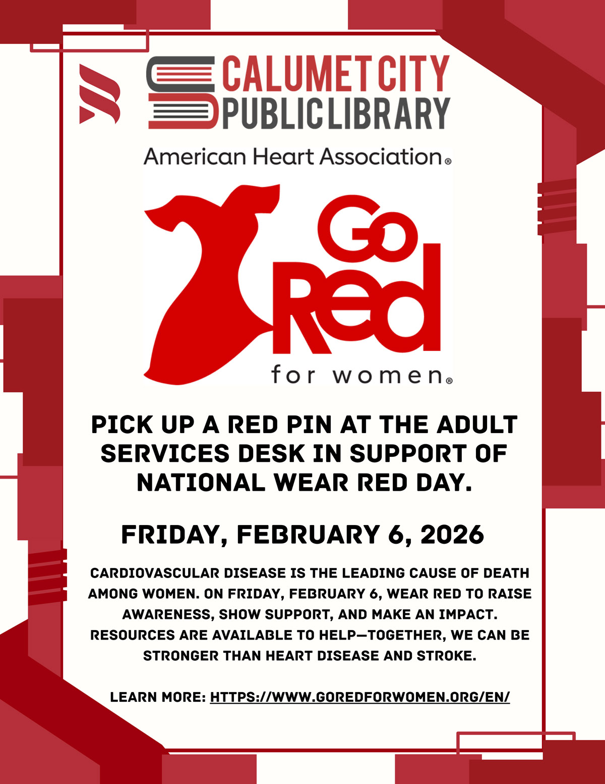 Go Red Day February 2, 2026February 2, 2026 Staff Friday is Go Red Day in support of heart health. Get your pin at the adult services desk. Written by Staff