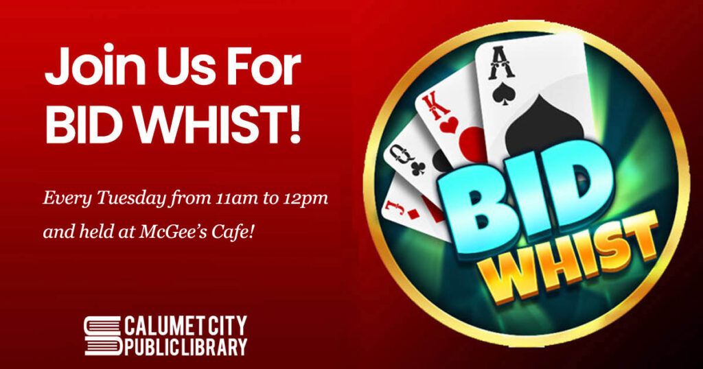 Join our Adult Services team every for Bid Whist! Held every Tuesday in February from 11am to 12pm, this takes place in McGee’s Cafe. Call (708) 862-6220 x248 to register.