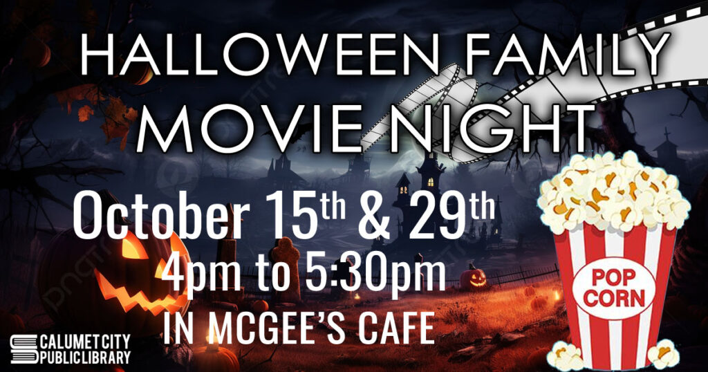 Join us in the McGee Cafe for a Halloween movie night! It will be from 4pm to 5:30pm on October 15th and 29th. Visit our youth calendar to register.
