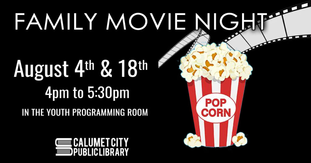 Join our Youth Services Department on August 4th for Family Movie Night from 4pm to 5:30pm. Call (708) 862-6220 x254 to register.