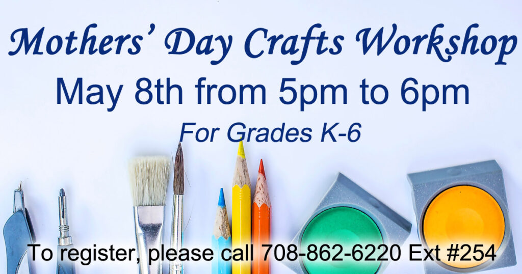 Please join our Youth Services Department for a Mother’s Day Crafts Workshop on May 8th. Call 708-862-6220 ext 254 to register.