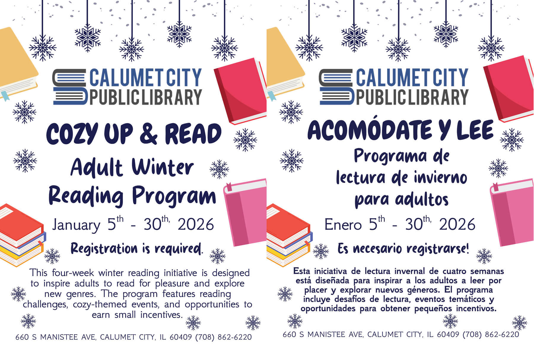 We will be hosting an activity to correlate to the season. Each session will offer a craft, storytime, and a movie. Call (708) 862-6220 x254 to register.